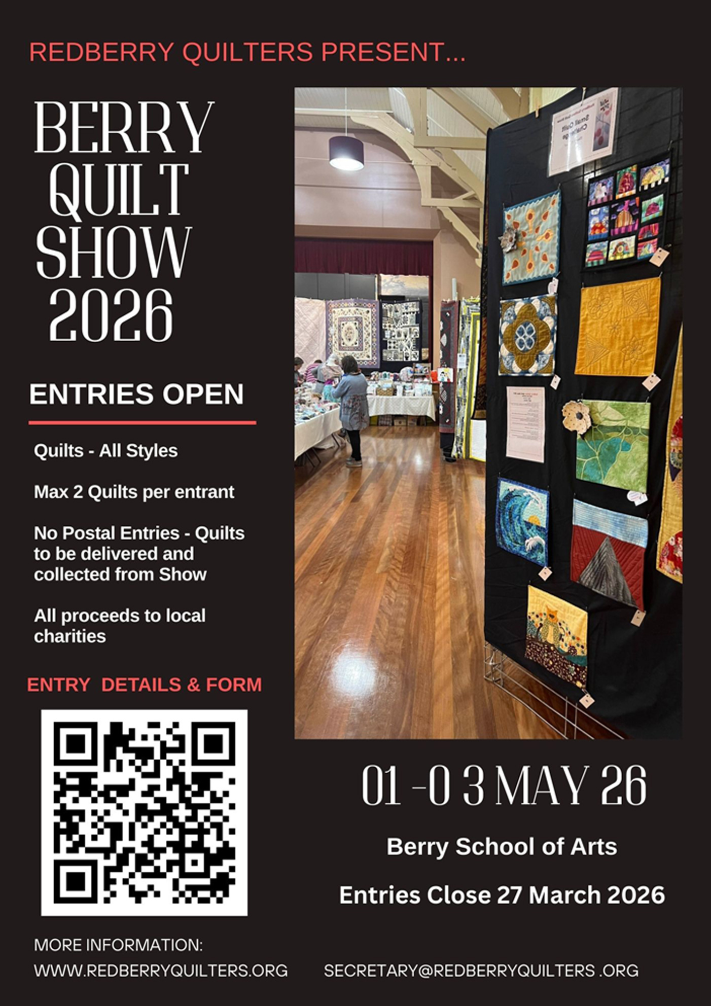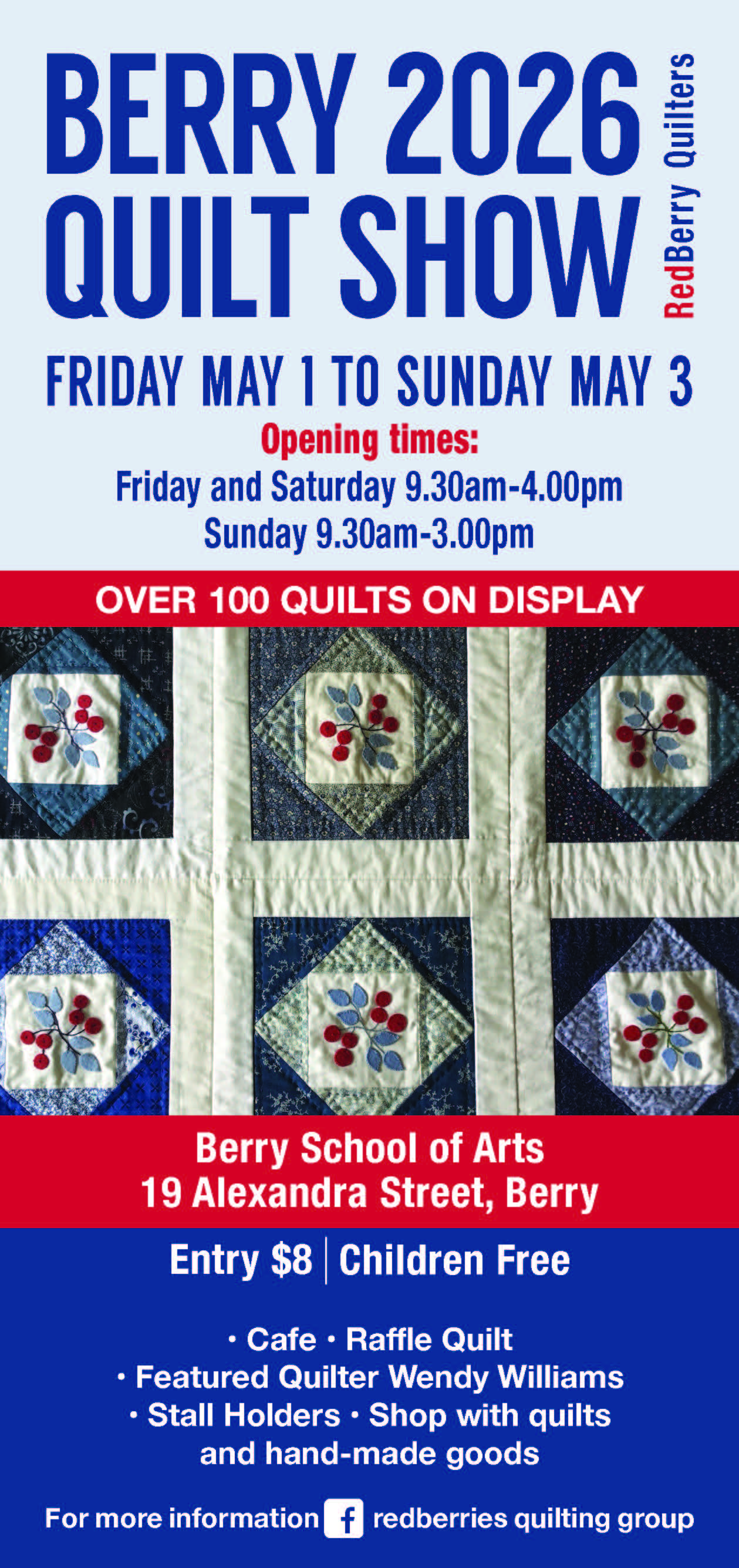 Redberry Quilters in Berry will hold their bi-annual Quilt Show this year at The Berry School of Arts in Berry from Friday to Sunday 01-03 May, 2026.