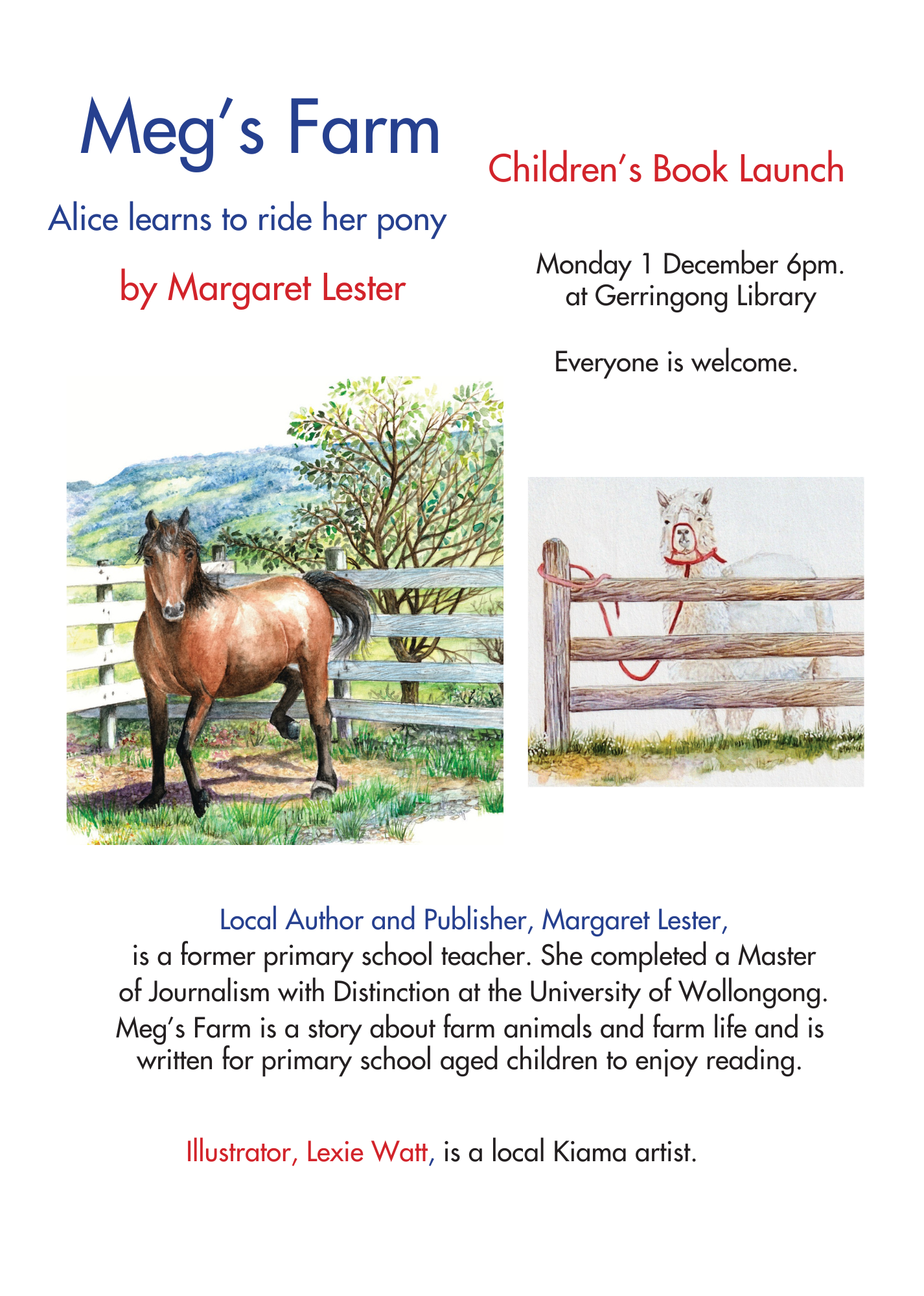 Local Author and Publisher, Margaret Lester, is a former primary school teacher. She completed a Master of Journalism with Distinction at the University of Wollongong. Meg’s Farm is a story about farm animals and farm life and is