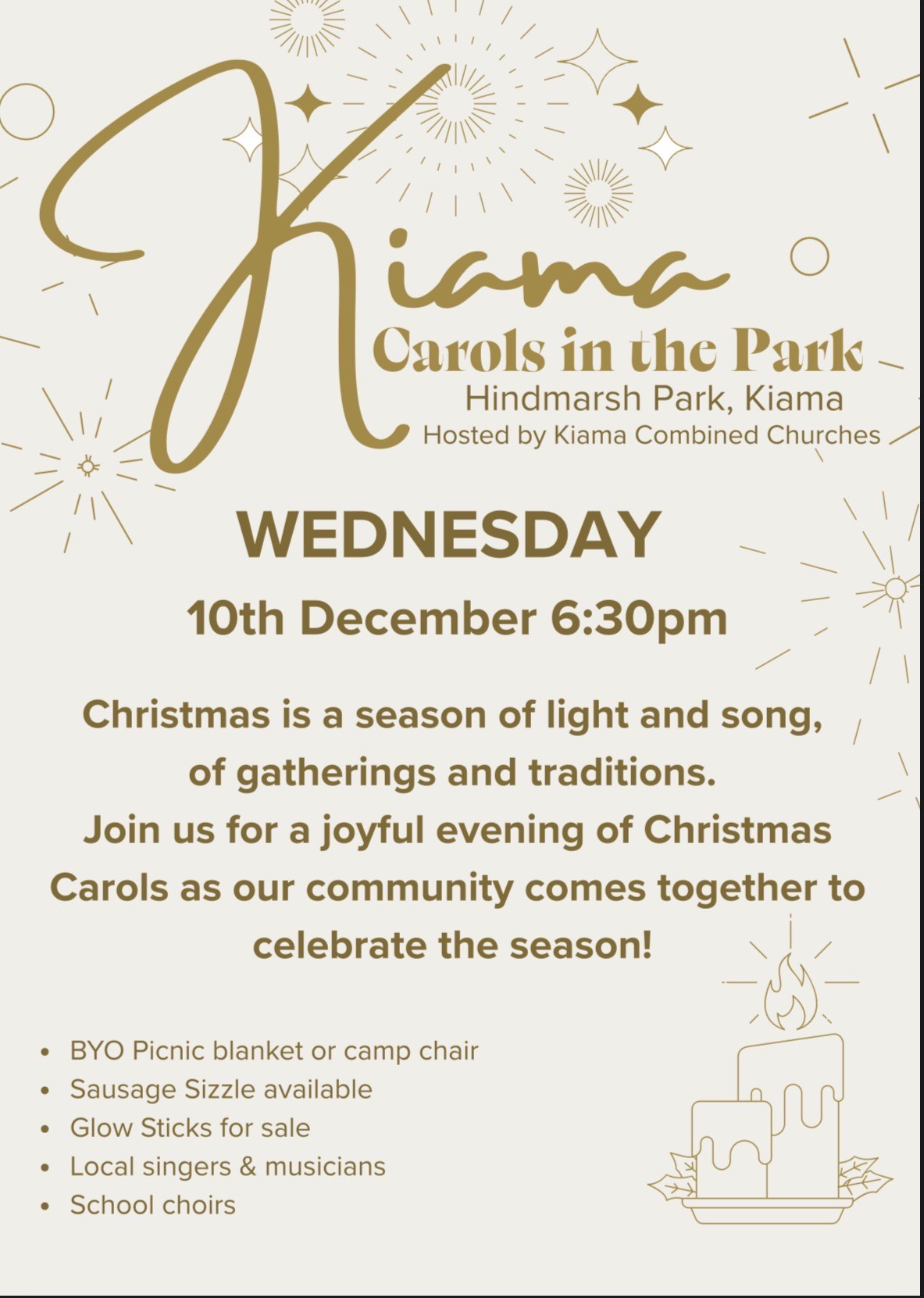 Christmas is a season of light and song, of gatherings and traditions. Join us for a joyful evening of Christmas Carols as our community comes together to celebrate the season! Wednesday 10th December 6:30pm Hindmarsh Park BYO Picnic blanket or camp chair • Sausage Sizzle available • Glow Sticks for sale • Local singers & musicians • School choirs