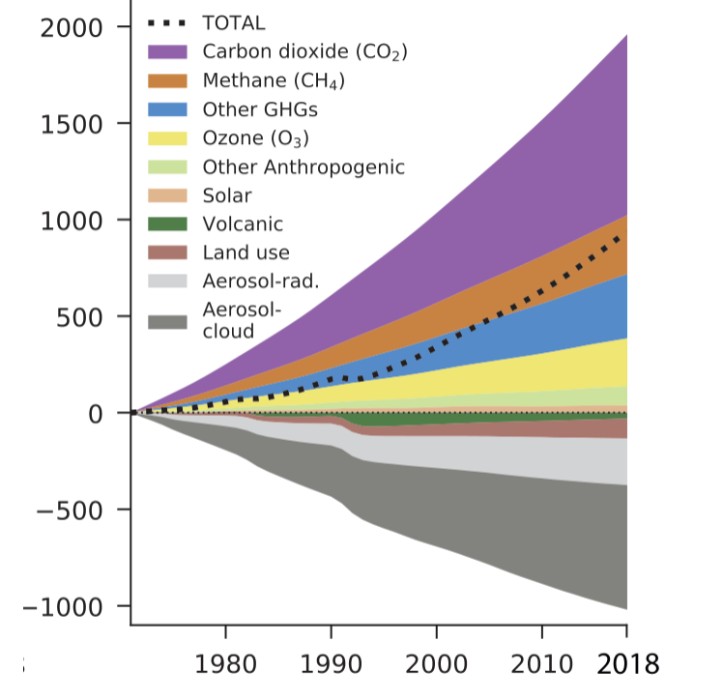 A positive ERF contributes to warming, and a negative to cooling. Well-mixed “greenhouse gases” are the most significant ‘positive’ drivers, mainly carbon dioxide and methane.