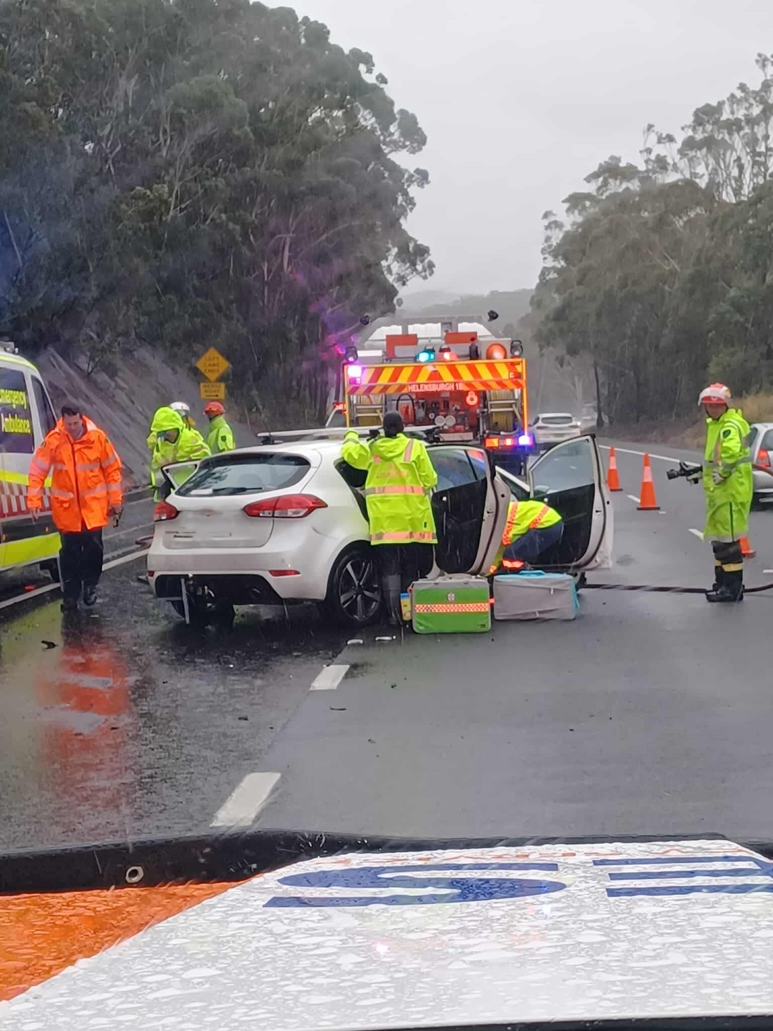 “There was a bit of smoke coming from the front of the car and one of the front doors was severely damaged so I just sat with the driver and kept her calm until help arrived,” he says. “I was in constant communication with the ambos and fire and rescue but the weather was horrendous so help was a while away.”
