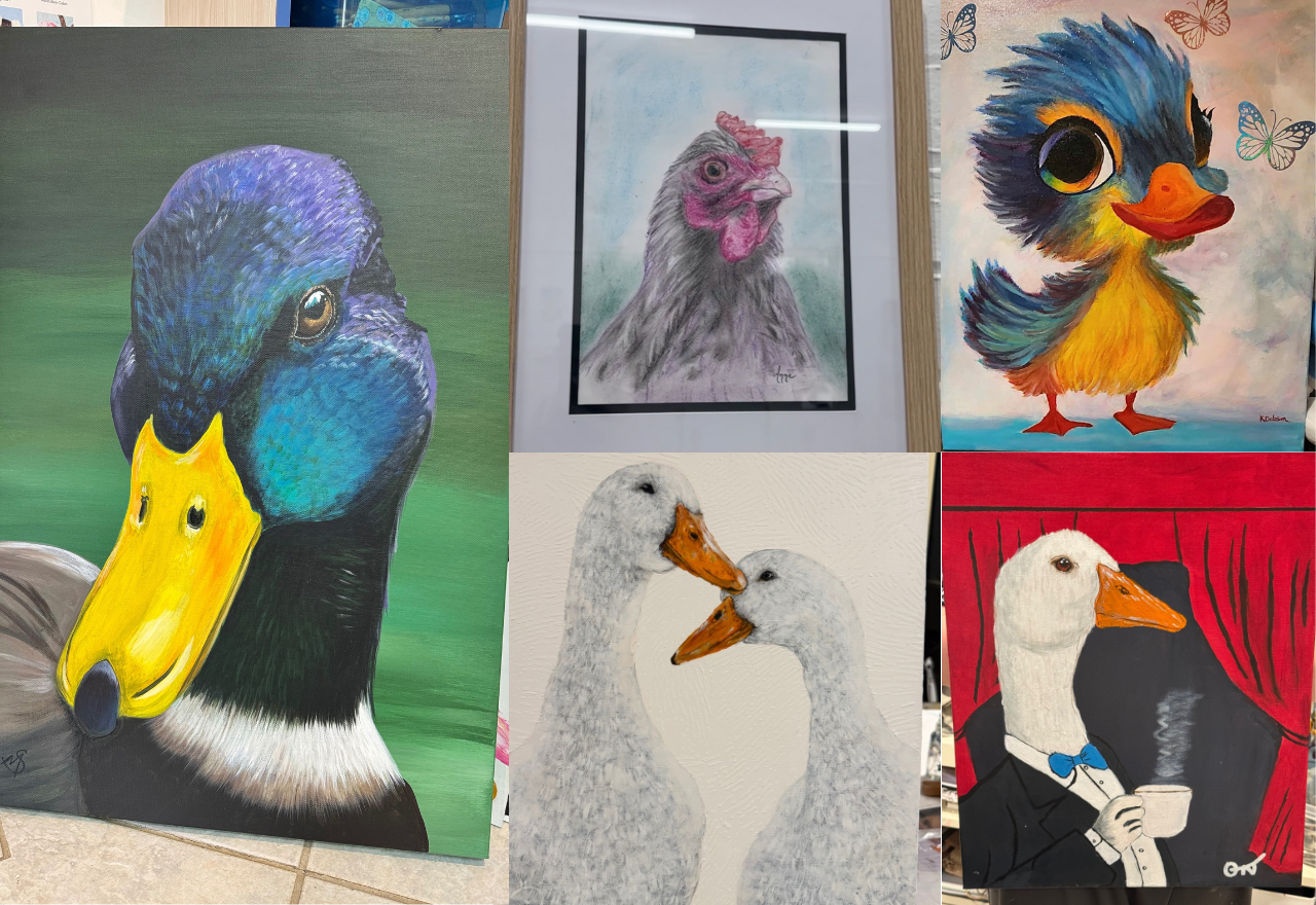 The winning paintings: (Left) Mal the Mallard duck by Michelle Springett, (Middle, top) Henny Penny by Anne Greenen, (Middle, bottom) Sea-saw and Yo-yo - Isla Downes, (Right, top) Mr Duckleberry by Kathryn Dobson (Right, bottom) The Wise Duck - Owynn Naughten. Photos: Michelle Springett