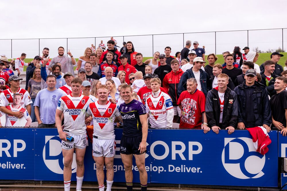 St George Illawarra Dragons or the Gerringong Lions? (From left to right) Hamish Stewart, Dylan Egan and Tyran Wishart. Photo: Game Face PhotographyKogarah's Netstrata Jubilee Stadium or Gerringong's Michael Cronin Oval? When the Dragons recorded their first win of the season last Saturday against the Melbourne Storm, you could have been forgiven for confusing the two.