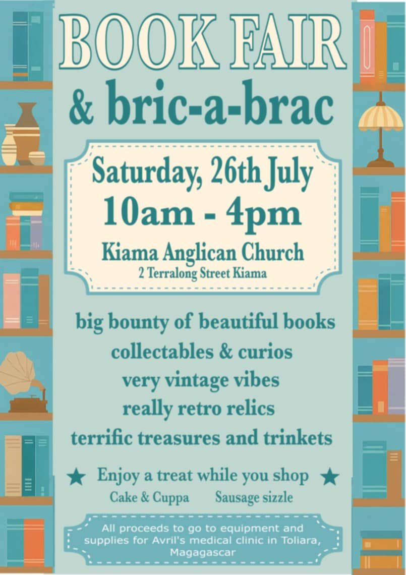The event will feature a BIG quality book fair, lots of beautiful bric-a-brac treasures, a $5 cuppa with baked treats, and a sausage sizzle - raising funds for a newly established medical clinic in Toliara, Madagascar.