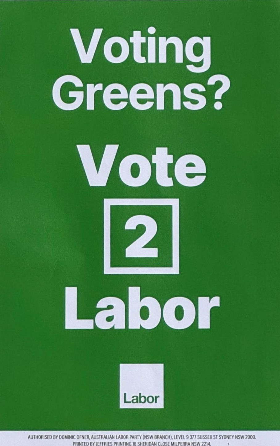 The Greens had placed Labor at fifth on their official how-to-vote cards behind Ellie Robertson from the Animal Justice Party, Don Fuggle (Legalise Cannabis Party) and Community Independent candidate Kate Dezarnaulds.