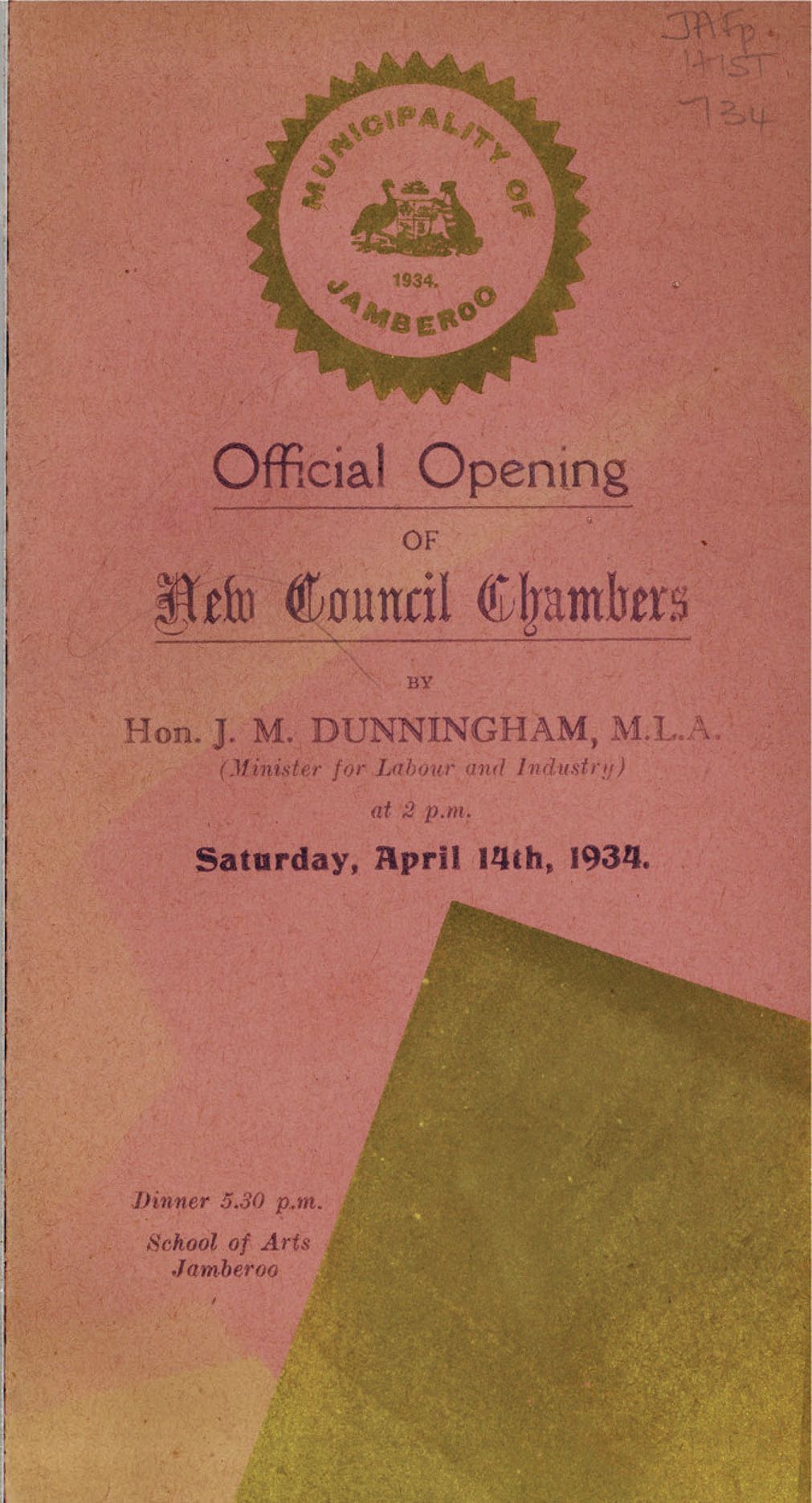 The Council Chambers building was built in 1934 and the wife of the Minister for Labour and Industry (the Hon. J.M. Dunningham) was given the honour of unveiling the plaque.