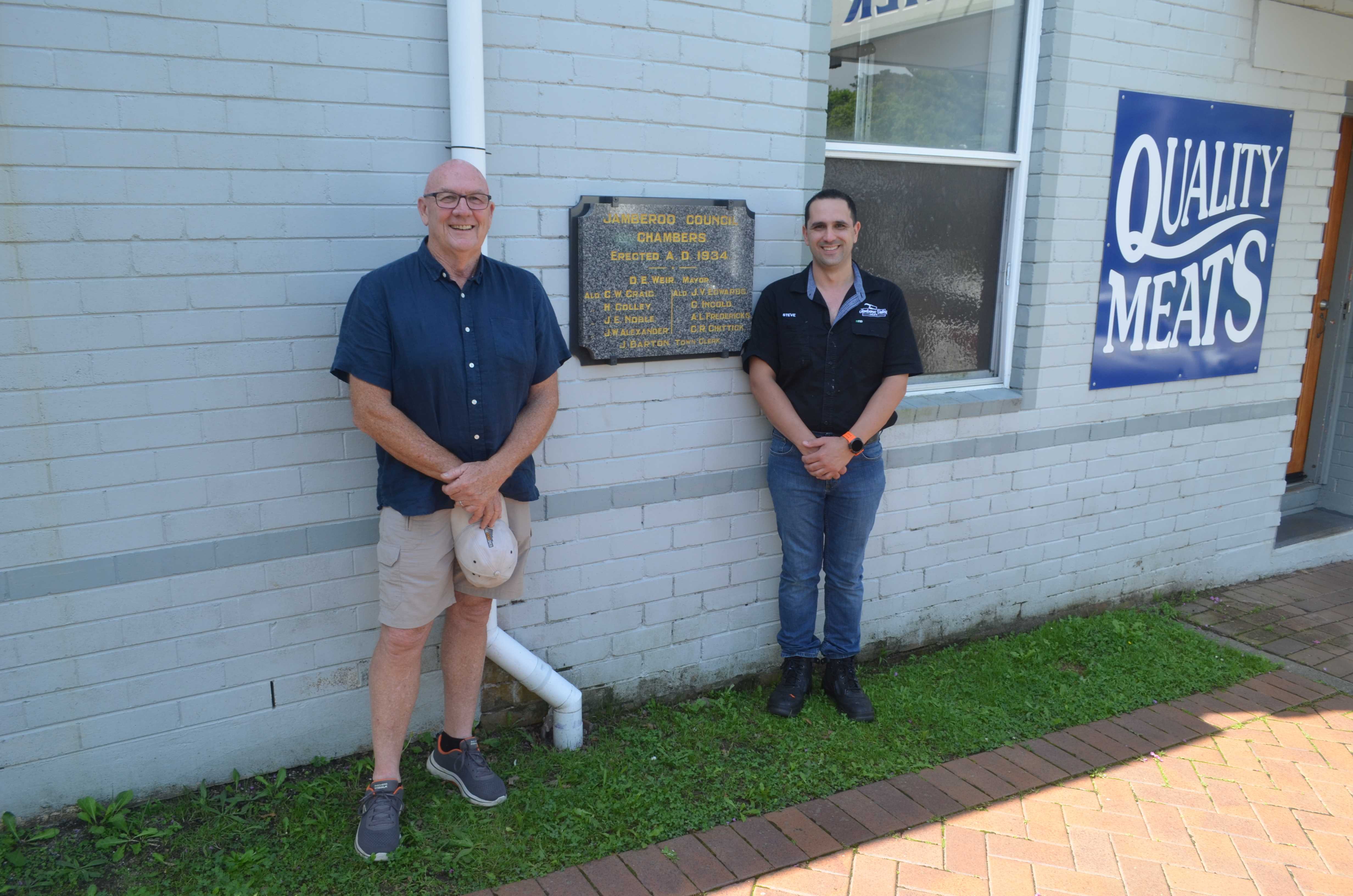 Stuart Richards and Steve McCure with the new plaque. Photo: The BugleA chance discovery by a Kiama resident during a spring clean-out of their house has led to the original plaque being brought back to life on the old Council Chambers building in Jamberoo.