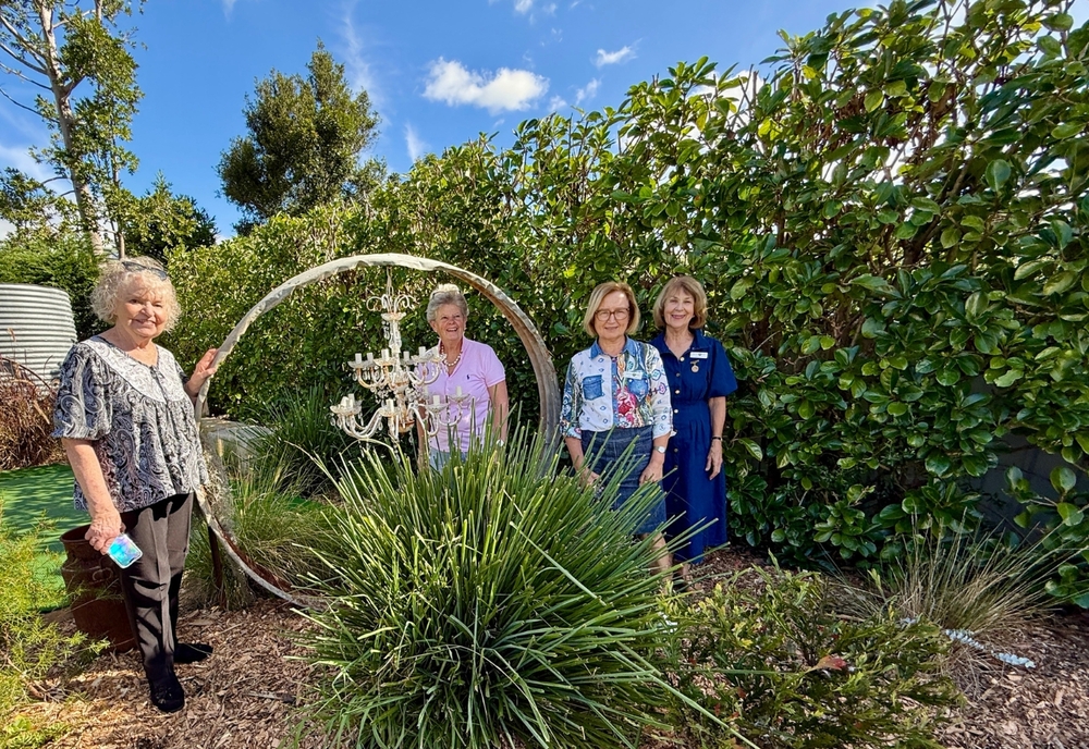 Kiama Garden Club Members Carol-Ann Trist, Viv Marris, Ursula Lischer and Jenny Brown with one of Jher Warner's varied sculptures and structures.