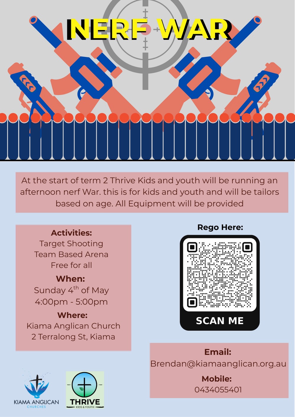 Kiama Anglican Church’s kids and youth worker, Brendan Leighton, is running the Nerf War as part of the new group called Thrive, which runs at the same time as Life at 4, a relaxed one-hour gathering for families and adults, where the big questions of life are tackled amid food, laughter and good conversations.
