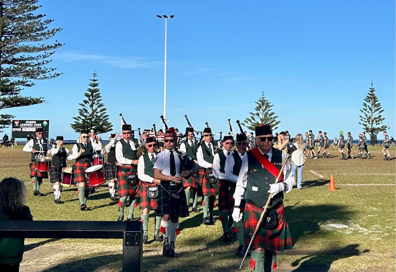 Kiama Pipe Marching Band playing Kiama onto the field for the Celtic Rugby Festival. Photo: Kiama Pipe Band