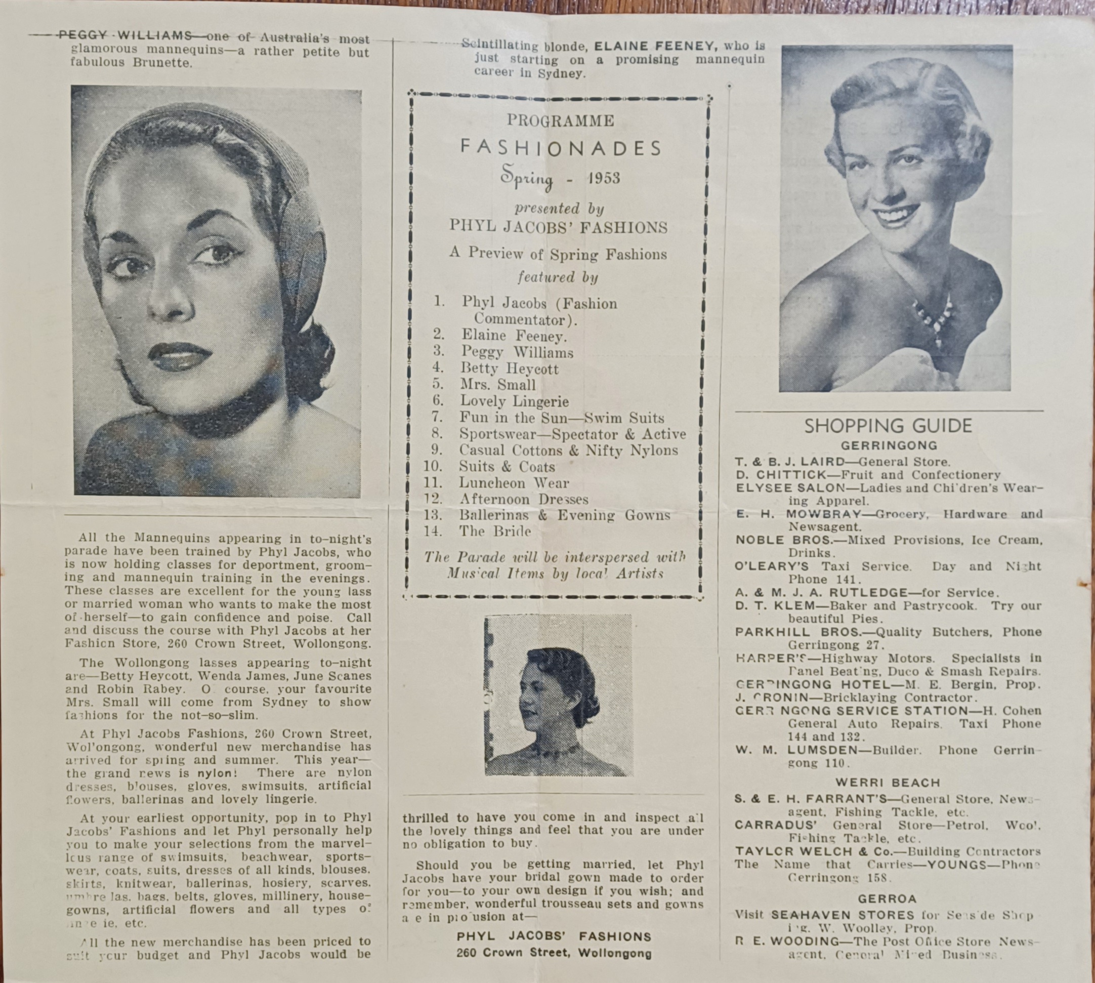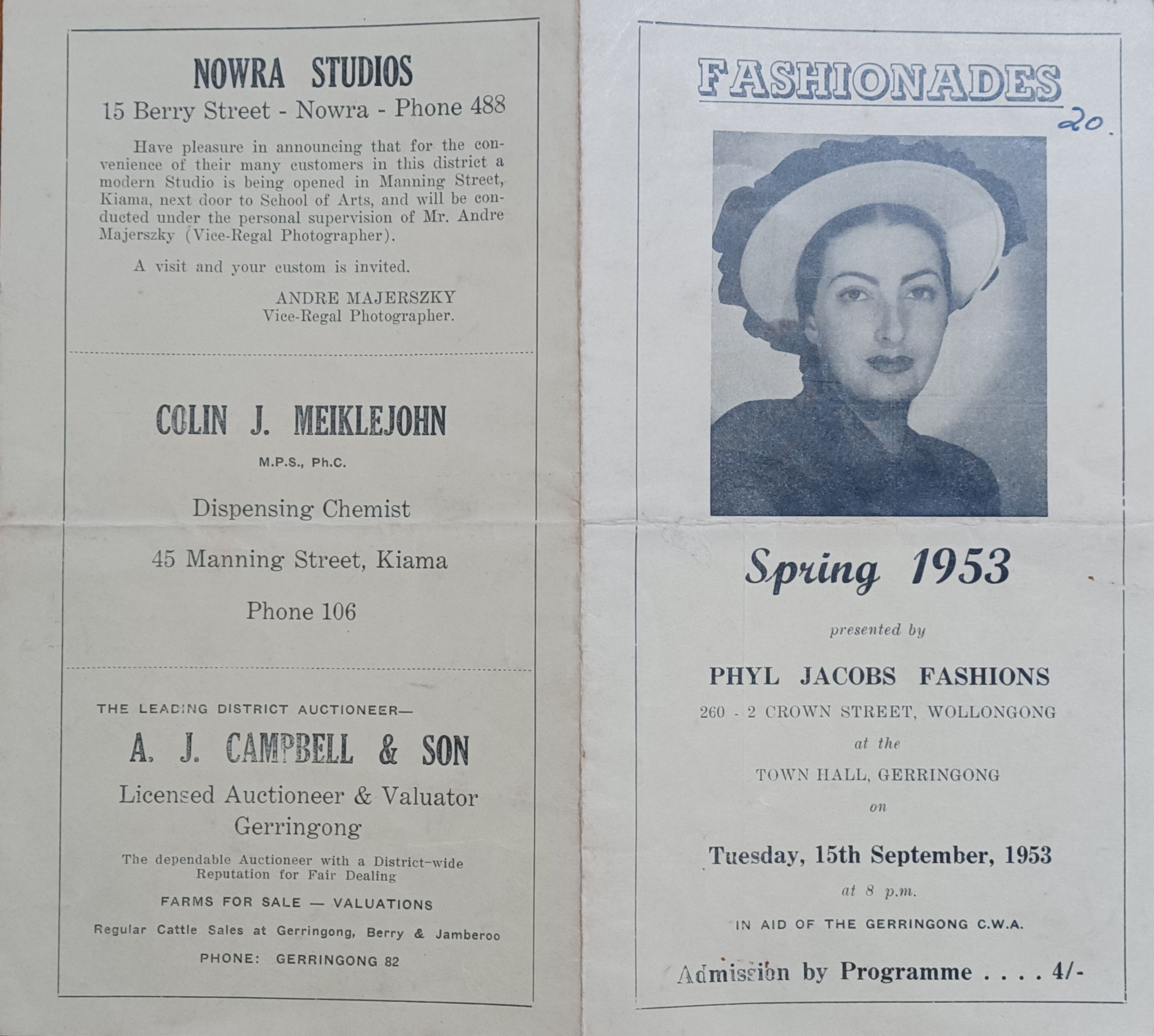 In spring of that year, a fashion establishment from Wollongong put on a show for the ladies at Gerringong Town Hall.