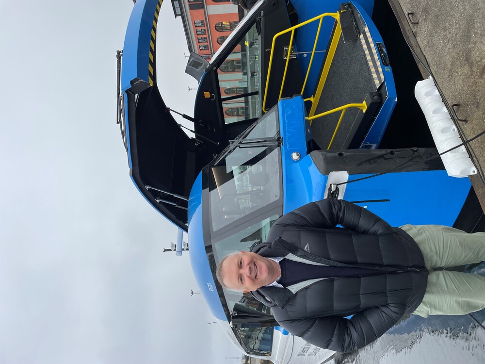 Mike was all smiles after riding the amazing Candela P12 foiling electric passenger ferry in Stockholm. Photo: Supplied