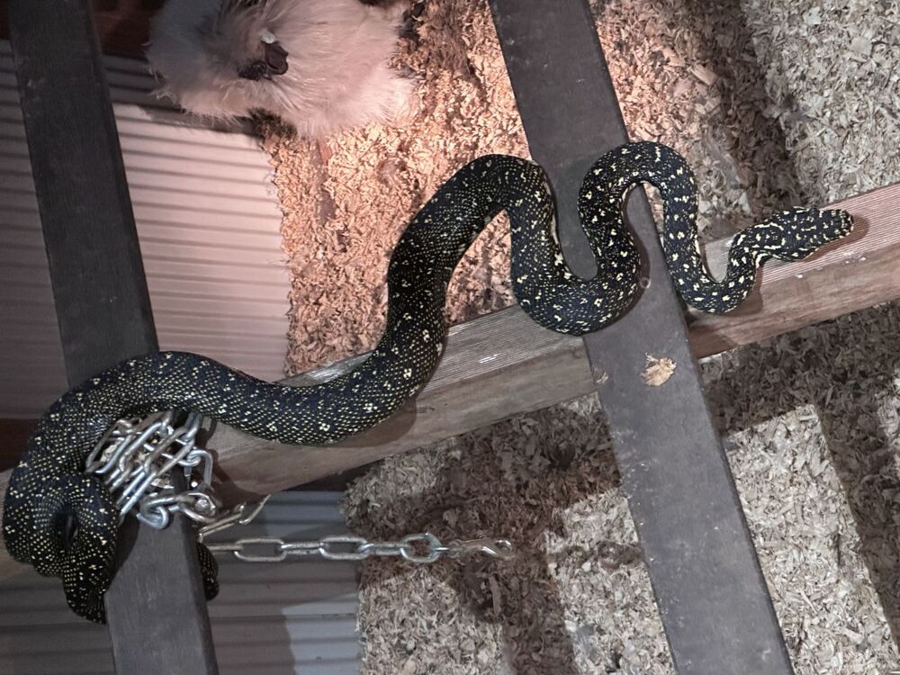Diamond pythons are non-venomous and protected. They play a vital role in controlling pests but can target eggs and smaller chickens. Snakes often get stuck in chicken wire after eating, as their bodies expand during digestion.