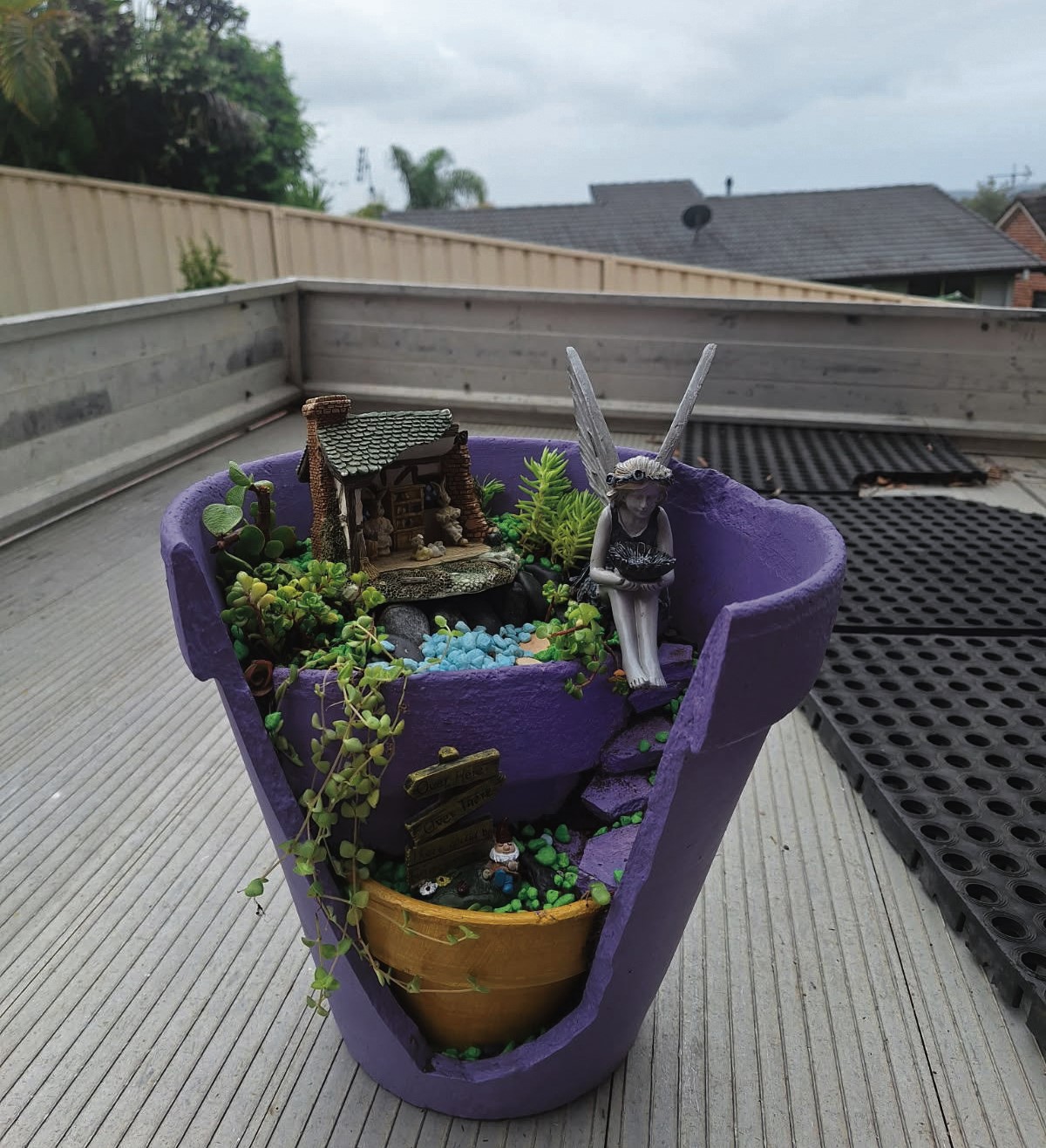 While the nation was glued to their screens watching the horror at Bondi Beach unfold Jane was busy fossicking through her local recycling centre for pots and bits and bobs to create a fairy garden.