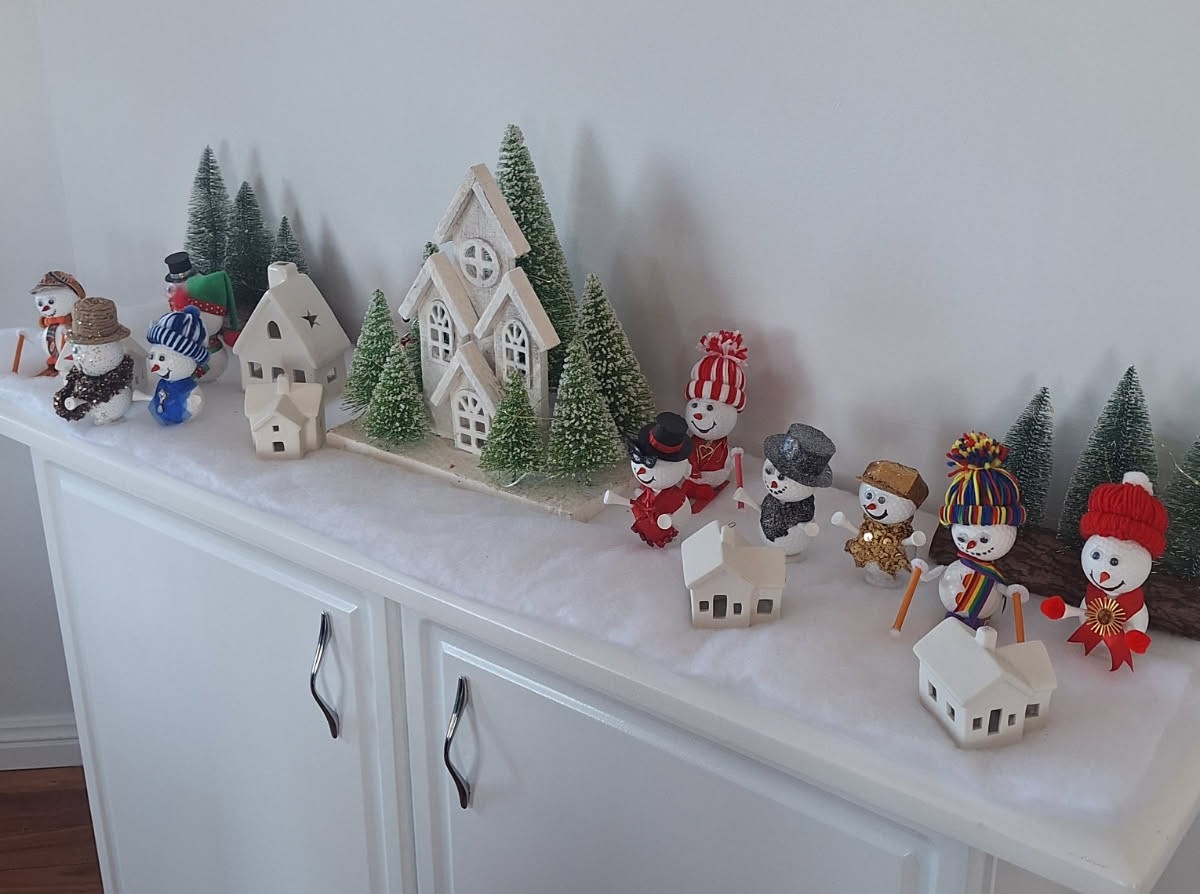 The little drummer boy sits beside Frosty the Snowman, the sunlight bouncing off his pointy orange nose. Next to him is a nativity set and a family of skiers all lined up waiting for Santa to arrive.