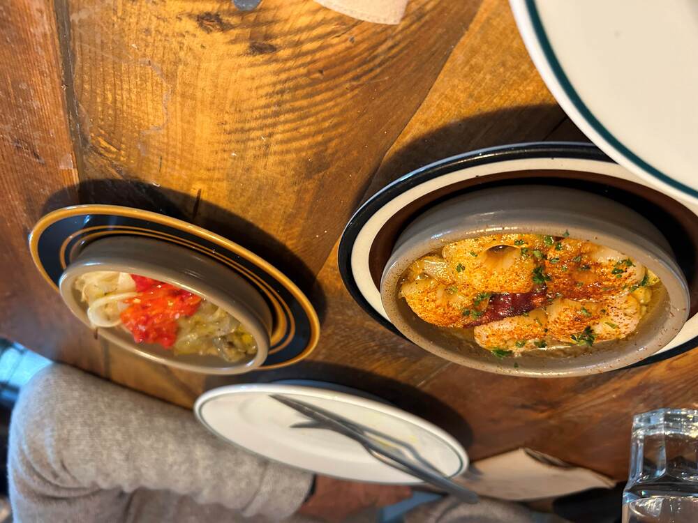 However, the anchovies were just that - six tiny anchovies smeared in olive oil on a tiny plate. There were four garlic prawns like the ones you find on top of pizzas, and they were relatively tasteless.