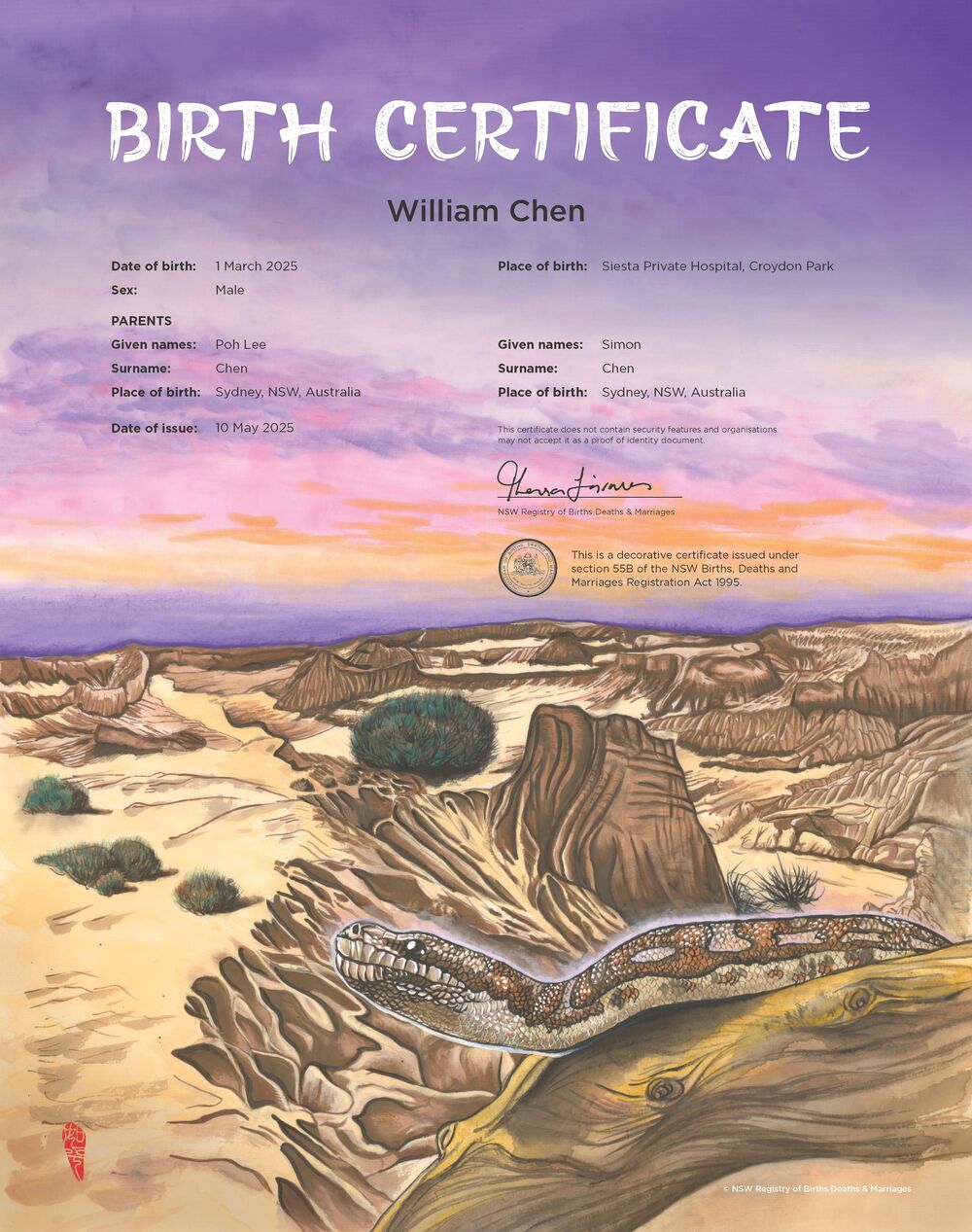 The Snake is the fourth Chinese Zodiac animal to be showcased in the commemorative collection offered by the NSW Registry of Births, Deaths and Marriages. Since the series launched in 2022, nearly 10,000 certificates have been purchased, with the Year of the Dragon proving the most popular so far, selling a record 3,428 certificates since February 2024.