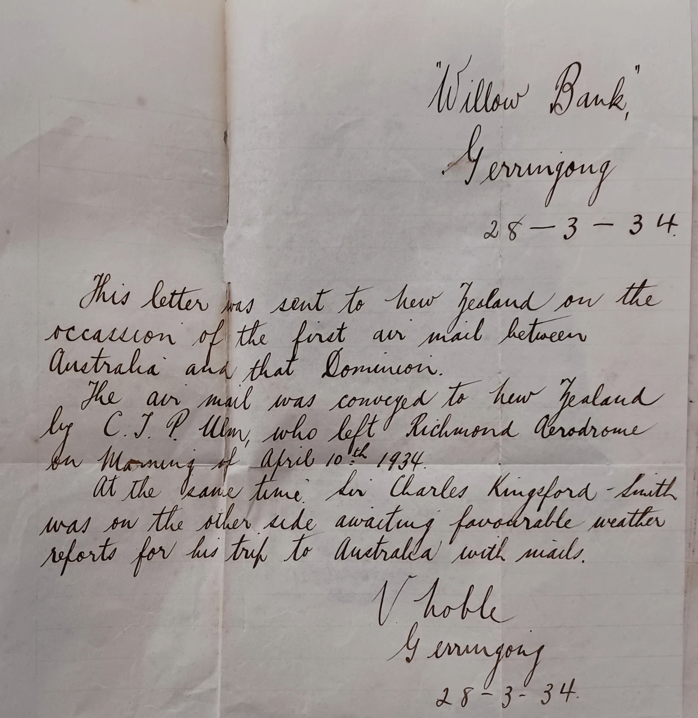Gerringong’s Val Noble wrote one of those very first letters that travelled in the plane Ulm flew.