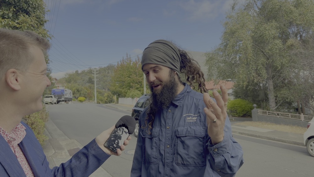 Alex Glover being interviewed in Lenah Valley. Photo: Steven White